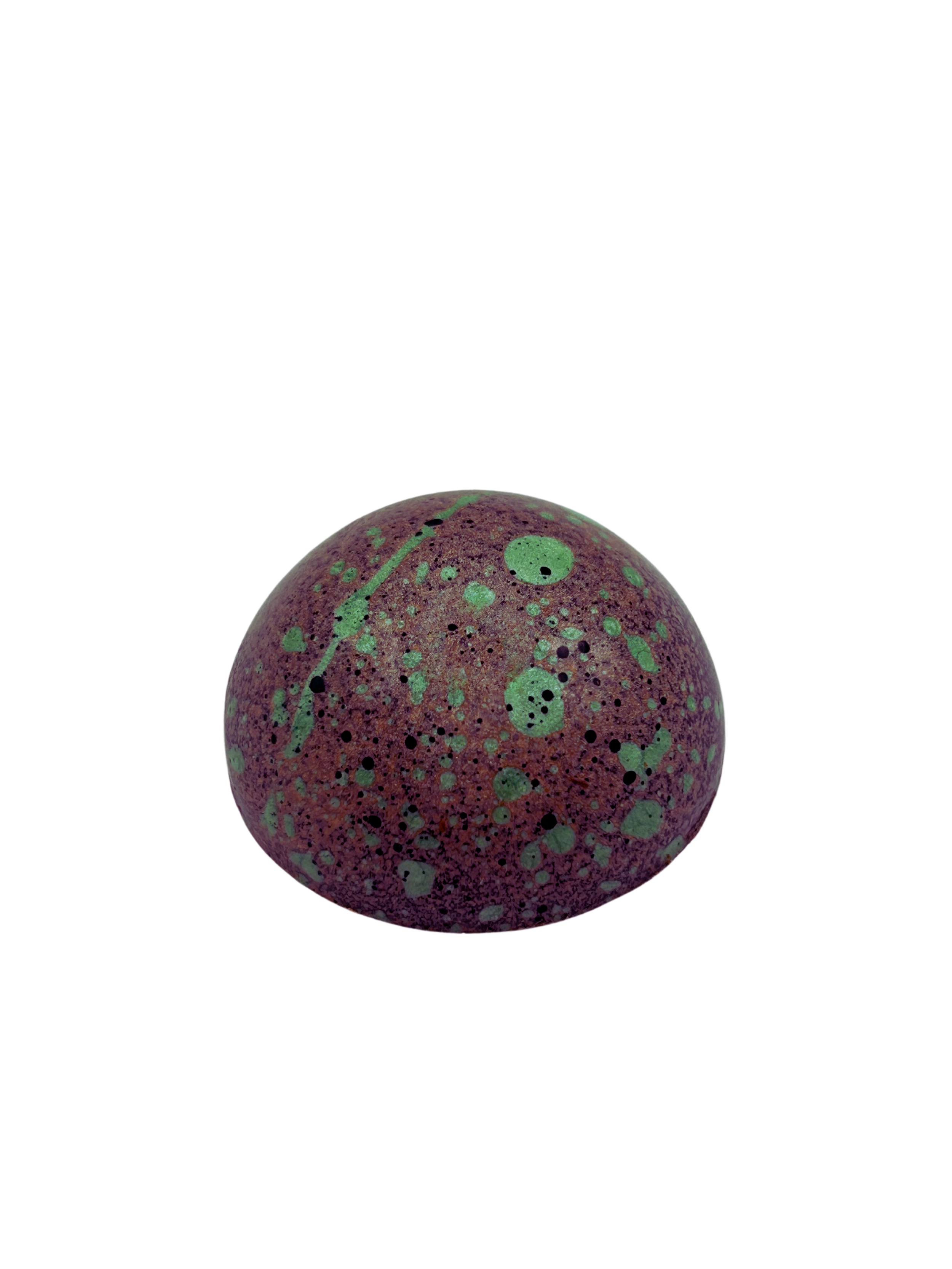 White chocolate shell filled with a layer of lychee pate de fruit and a layer of rose flavored white chocolate filling.