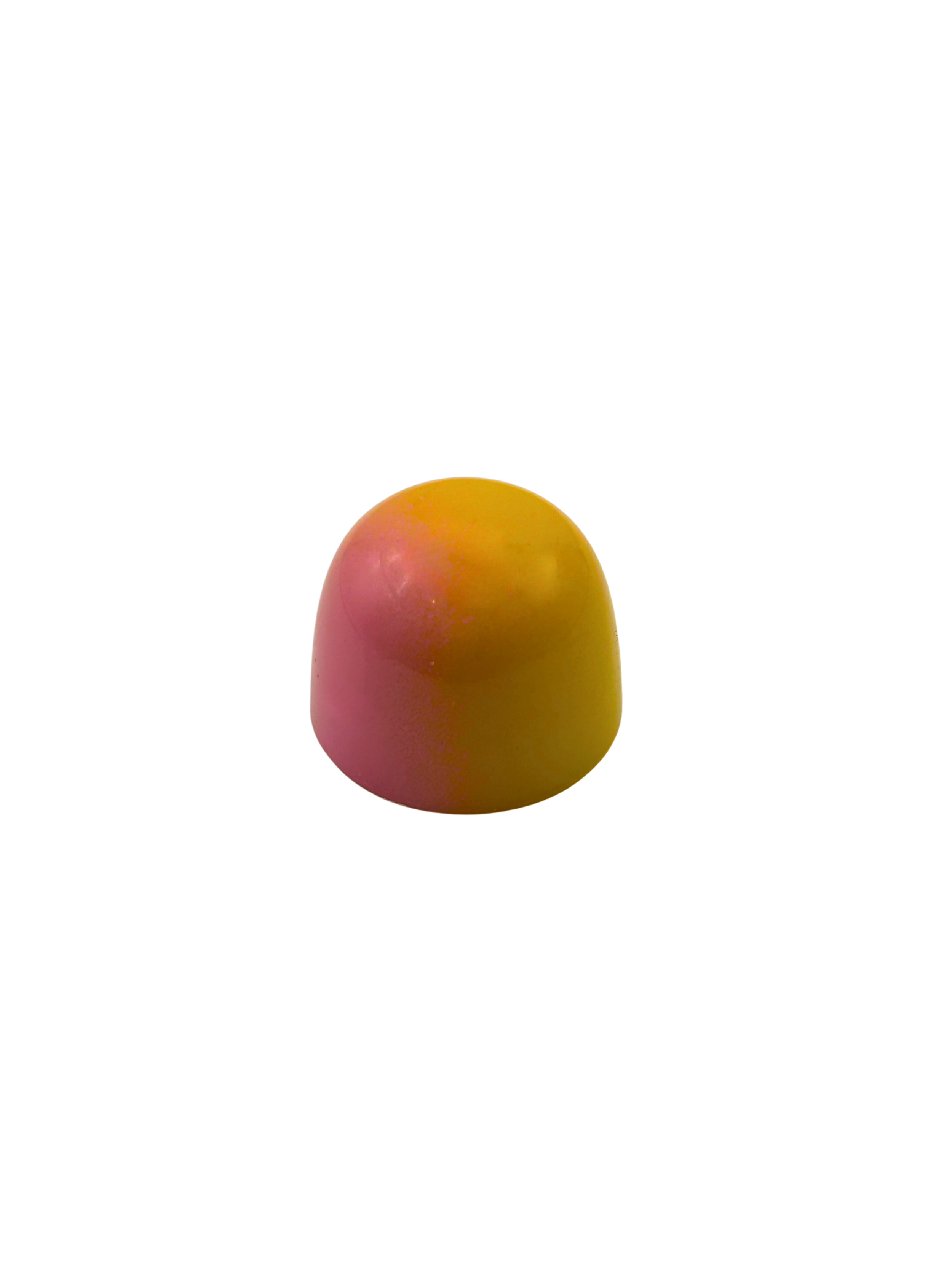 Filled with a yuzu flavored marshmallow and a passionfruit caramel.